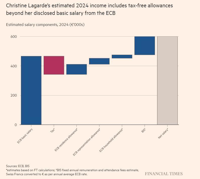Εκτός από τον βασικό της μισθό, η Λαγκάρντ λαμβάνει περίπου 135.000 ευρώ σε πρόσθετες παροχές για στέγαση και άλλα θέματα, σύμφωνα με την ανάλυση των FT. Η ετήσια έκθεση της ΕΚΤ δεν παρέχει πληροφορίες για τις πρόσθετες παροχές καθενός από τα μέλη του εκτελεστικού συμβουλίου.