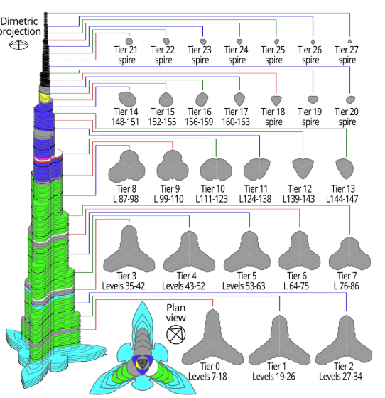 Η τριμερής γεωμετρία του δαπέδου σε σχήμα Υ έχει σχεδιαστεί για να βελτιστοποιεί τον χώρο των κατοικιών και των ξενοδοχείων, σύμφωνα με την ιστοσελίδα του κτηρίου. Ένας κεντρικός πυρήνας και πτέρυγες με αντηρίδες χρησιμοποιούνται για να υποστηρίξουν το ύψος του κτήρίου. Ο κεντρικός πυρήνας του Burj Khalifa στεγάζει όλα τα κάθετα μέσα μεταφοράς εκτός από τις σκάλες εξόδου μέσα σε κάθε πτέρυγα. Η κατασκευή διαθέτει επίσης ένα σύστημα επένδυσης που έχει σχεδιαστεί για να αντέχει στις ζεστές καλοκαιρινές θερμοκρασίες του Ντουμπάι. Περιέχει συνολικά 57 ανελκυστήρες και 8 κυλιόμενες σκάλες.
