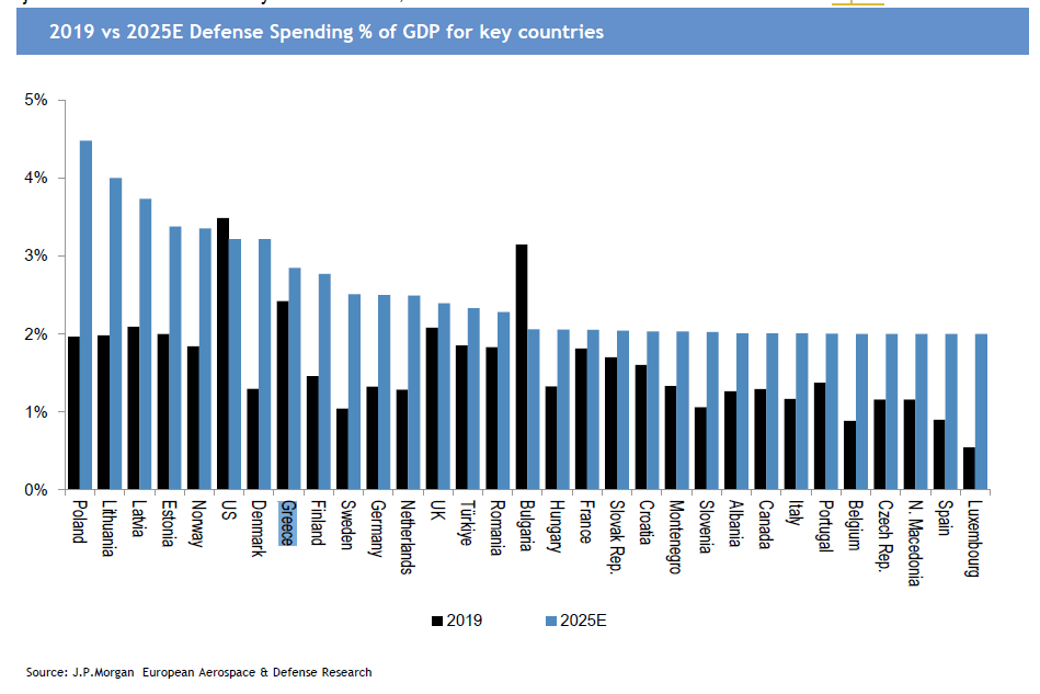 Ιδιαίτερη σημασία έχει η γερμανική δαπάνη, η οποία ξεχωρίζει, ενώ παράλληλα η JP Morgan βλέπει υψηλότερο πολλαπλασιαστή από τον συνηθισμένο για την προβλεπόμενη αύξηση στις δαπάνες Άμυνας σε ολόκληρη την ΕΕ, καθώς αυξάνεται το ποσοστό των εγχώριων παραγγελιών.