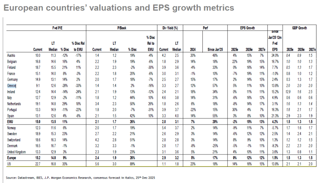 Ωστόσο, για το 2026, οι αναλυτές της JP Morgan προβλέπουν αλλαγή του κλίματος, με οδηγό μια σειρά από πιθανούς καταλύτες, όπως η μεγαλύτερη επίδραση των γερμανικών μέτρων στήριξης και η βελτίωση του πιστωτικού παλμού στην Ευρωζώνη. Το 2025 τα κέρδη στην Ευρωζώνη μειώθηκαν όπως αναμενόταν, γεγονός που εμπόδισε την επέκταση του ράλι μετά τον Μάρτιο, όμως η τράπεζα προβλέπει αναστροφή της τάσης φέτος, με ανάκαμψη στα εταιρικά κέρδη.