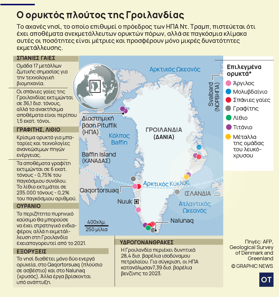 Εκτός από τη στρατηγική γεωπολιτική της θέση, η Γροιλανδία είναι γνωστή για την αφθονία των ανεκμετάλλευτων πρώτων υλών της, από αποθέματα πετρελαίου και φυσικού αερίου έως σημαντικά κοιτάσματα ορυκτών και έναν θησαυρό σπάνιων γαιών.