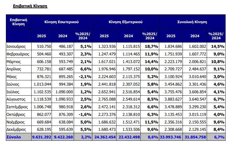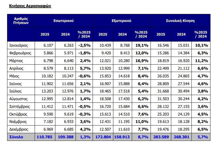 Τόσο οι πτήσεις εσωτερικού όσο και οι διεθνείς πτήσεις σημείωσαν άνοδο κατά 1,3% και 8,7% σε σχέση με το 2024.