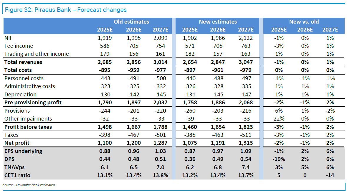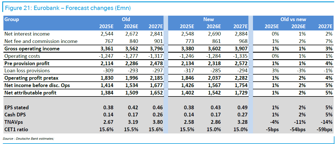 Παρά την προτίμηση της Deutsche Bank στη Eurobank, η τράπεζα παραμένει σχετικά πιο σύνθετη, καθώς πάνω από το 50% των καθαρών κερδών προέρχεται από διεθνείς δραστηριότητες, με ισχυρή απόδοση στη Βουλγαρία και προοπτικές στην Κύπρο μετά από κινήσεις M&A. Παρά τις δυσκολίες αυτές, η Eurobank προσφέρει την καλύτερη ισορροπία μεταξύ υψηλής ποιότητας και ισχυρής κερδοφορίας στη χώρα.