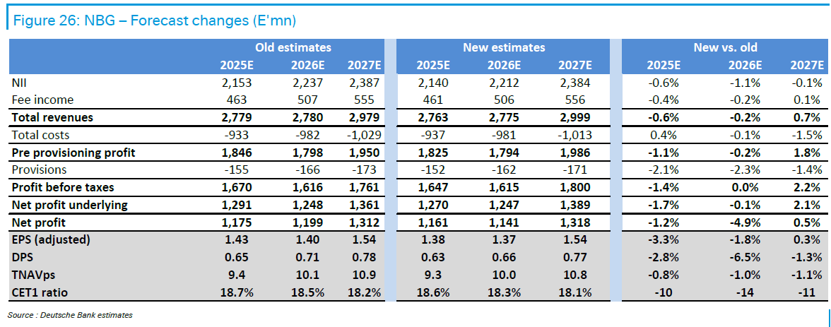 Η Deutsche Bank σημειώνει ότι, παρά τις ανησυχίες για την ευαισθησία των NII στις μεταβολές επιτοκίων, ο αντίκτυπος ήταν περιορισμένος, με τα NII να έχουν αυξηθεί περίπου κατά 55% από το χαμηλό του 2021, ενώ η μελλοντική σταθερότητα αναμένεται να ευθυγραμμιστεί με την ανάπτυξη των δανείων.