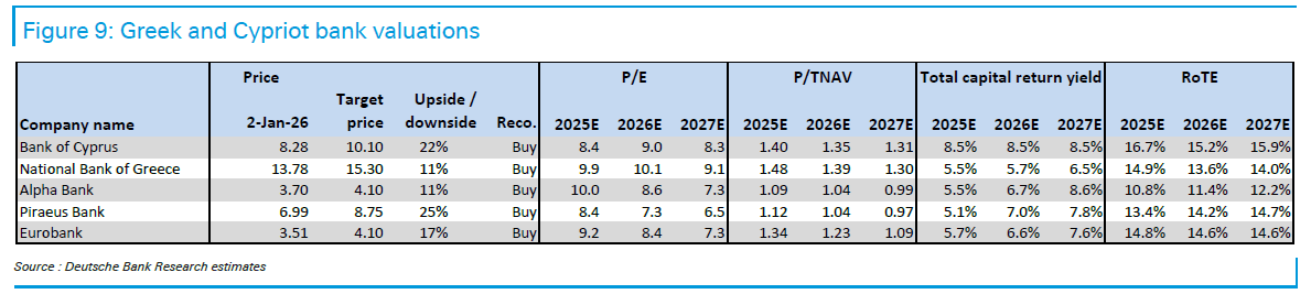 Η Deutsche Bank επισημαίνει ότι, ενώ οι μετοχές των ελληνικών τραπεζών έχουν ξεπεράσει γενικά τον δείκτη ευρωπαϊκών τραπεζών, οι αποτιμήσεις τους παραμένουν σημαντικά χαμηλότερες σε σύγκριση με τον μέσο όρο των ευρωπαϊκών τραπεζών.