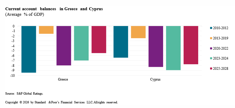 Παρά τη σημαντική πρόοδο στην οικονομική ανάπτυξη και τα δημόσια οικονομικά, οι εξωτερικές ανισορροπίες σε Ελλάδα και Κύπρο εξακολουθούν να υφίστανται. Οι δύο χώρες καταγράφουν τα μεγαλύτερα ελλείμματα τρεχουσών συναλλαγών στην ευρωζώνη, με μέσο όρο 8,5% του ΑΕΠ στην Κύπρο και 7,6% στην Ελλάδα την περίοδο 2020-2024.