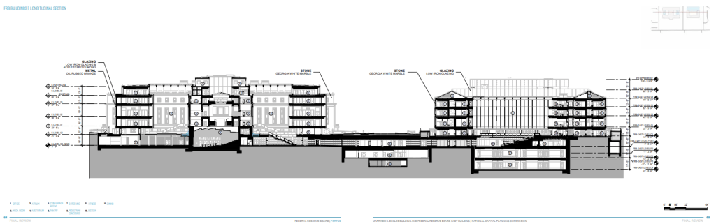 Τα πιο τεχνικά απαιτητικά και δαπανηρά στοιχεία του έργου είναι υπόγεια. Η επέκταση της Fed περιλαμβάνει τη μετατροπή ενός υπάρχοντος χώρου στάθμευσης κάτω από το κτίριο Eccles σε χώρο γραφείων, την προσθήκη μιας πενταόροφης επέκτασης στο Ανατολικό Κτίριο με τέσσερις ορόφους κάτω από το έδαφος και την κατασκευή ενός νέου υπόγειου χώρου στάθμευσης κάτω από το νότιο γκαζόν του Ανατολικού Κτιρίου. Οι κατασκευαστές αντιμετώπισαν υψηλότερη από την αναμενόμενη στάθμη του υδροφόρου ορίζοντα, γεγονός που περιέπλεξε την εκσκαφή.