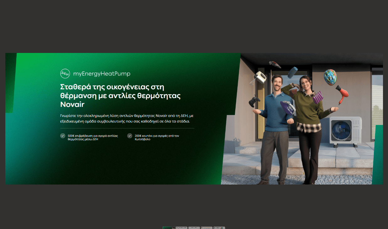 Με το ΔΕΗ myEnergy HeatPump, η ΔΕΗ επιβεβαιώνει τον ηγετικό της ρόλο στη μετάβαση προς μία πιο βιώσιμη και πιο πράσινη ενεργειακή πραγματικότητα, επενδύοντας σε λύσεις που αναβαθμίζουν την ποιότητα ζωής, μειώνουν το ενεργειακό κόστος και θέτουν στο επίκεντρο τον πελάτη, προσφέροντας σιγουριά και μακροχρόνια αξία για το σπίτι.