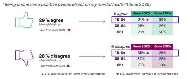 Το 35% των ατόμων ηλικίας 18-34 διαφωνεί με την άποψη ότι το διαδίκτυο βοηθά την ψυχική του υγεία, ποσοστό αυξημένο κατά 7% σε σχέση με το 2024. Το στοιχείο αυτό υποδηλώνει μια βαθύτερη και επιδεινούμενη αποξένωση των νέων από τον ψηφιακό κόσμο.