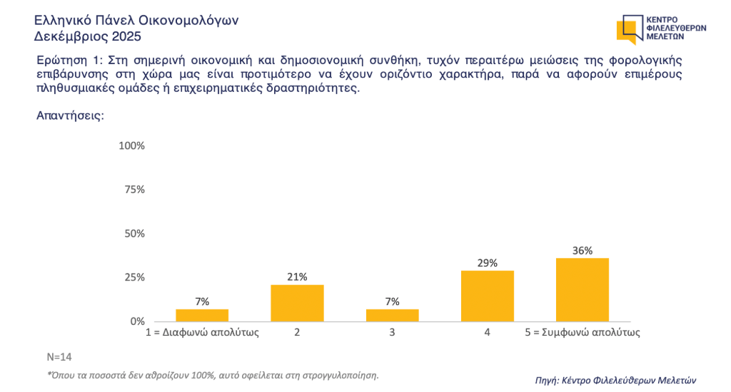Πάνω από 6 στα 10 μέλη του Ελληνικού Πάνελ Οικονομολόγων του ΚΕΦίΜ προτείνουν οι τυχόν μελλοντικές φορολογικές ελαφρύνσεις να έχουν οριζόντιο αντί για στοχευμένο χαρακτήρα, σύμφωνα με τα αποτελέσματα της ερώτησης του Πάνελ για τον Δεκέμβριο.