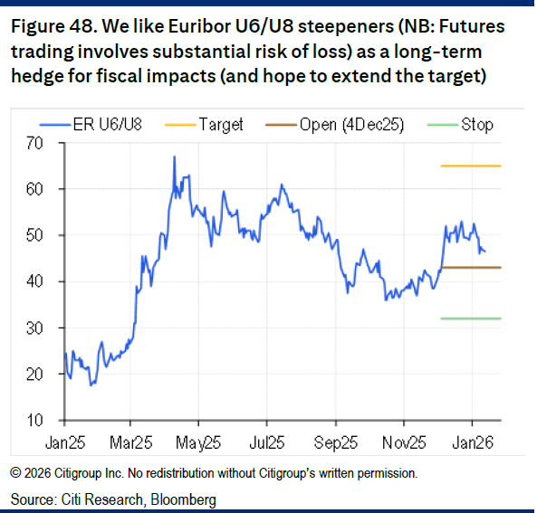 Παρότι η Citi δεν αναμένει σύσφιξη της νομισματικής πολιτικής στο άμεσο μέλλον, θεωρεί ότι η πιθανότητα μελλοντικής αύξησης επιτοκίων ενισχύεται σταδιακά. Αυτό οδηγεί την τράπεζα στη διατήρηση θέσεων υπέρ της περαιτέρω απότομης κλίσης της καμπύλης Euribor, ως δομικό και όχι βραχυπρόθεσμο στοίχημα.
