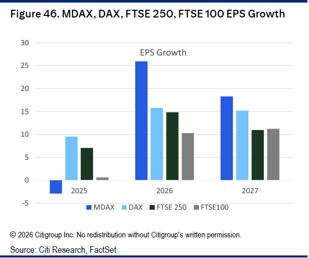 Για τον λόγο αυτό, η Citi εκτιμά ότι ο γερμανικός δείκτης MDAX είναι καλύτερα τοποθετημένος για να υπεραποδώσει σε σχέση με τον FTSE 250 του Λονδίνου.