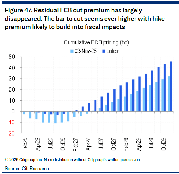 Όπως επισημαίνεται, η αγορά έχει σε μεγάλο βαθμό αφαιρέσει την προεξόφληση περαιτέρω μειώσεων επιτοκίων, ενώ η ΕΚΤ δεν έδωσε σήματα αντίθεσης στη συνεδρίαση του Δεκεμβρίου.