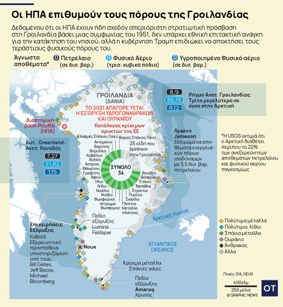 Οπως φαίνεται και στο γράφημα η Γροιλανδία έχει τεράστια αποθέματα υδρογονανθράκων (πετρελαίου και φυσικού αερίου) καθώς και εναν πλούσιο κατάλογο κρίσιμων ορυκτών με την «υπογραφή» της Γεωλογικής Υπηρεσίας των ΗΠΑ (USGS).