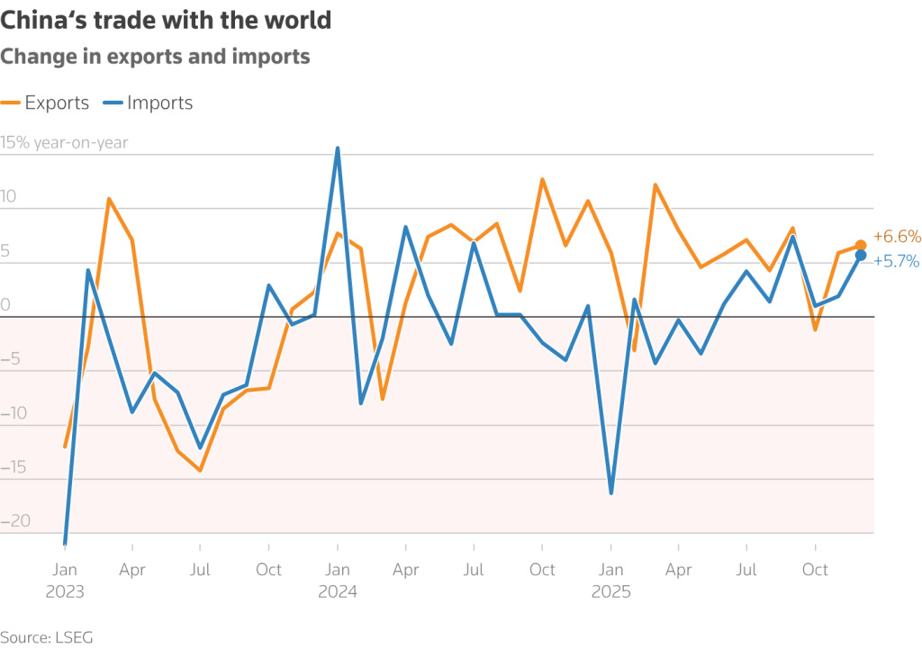Οι εξαγωγές της δεύτερης μεγαλύτερης οικονομίας στον κόσμο αυξήθηκαν κατά 6,6% σε όρους αξίας σε ετήσια βάση τον Δεκέμβριο, σε σύγκριση με αύξηση 5,9% τον Νοέμβριο. Οι οικονομολόγοι που ρωτήθηκαν από το Reuters ανέμεναν αύξηση 3,0%.