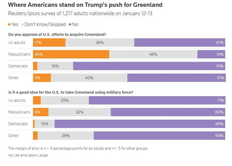 Μόνο το 4% των Αμερικανών – συμπεριλαμβανομένου ενός στους δέκα Ρεπουμπλικάνους και σχεδόν κανενός Δημοκρατικού – δήλωσε ότι θα ήταν «καλή ιδέα» οι ΗΠΑ να χρησιμοποιήσουν στρατιωτική δύναμη για να καταλάβουν τη Γροιλανδία από τη Δανία. Περίπου το 71% θεώρησε ότι θα ήταν κακή ιδέα, συμπεριλαμβανομένων εννέα στους δέκα Δημοκρατικούς και έξι στους δέκα Ρεπουμπλικάνους. Περίπου ένας στους τρεις Ρεπουμπλικάνους δήλωσε ότι δεν ήταν σίγουρος αν ήταν καλή ή κακή ιδέα.