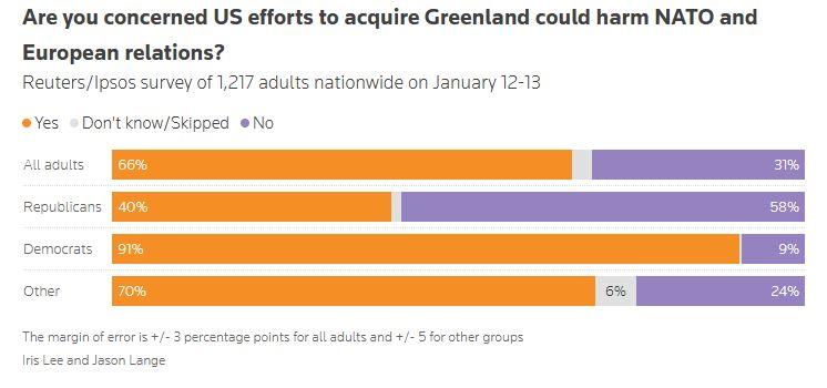 Περίπου το 66% των ερωτηθέντων, συμπεριλαμβανομένου του 91% των Δημοκρατικών και του 40% των Ρεπουμπλικάνων, δήλωσαν ότι ανησυχούν ότι οι προσπάθειες των ΗΠΑ να αποκτήσουν τη Γροιλανδία θα βλάψουν τη συμμαχία του ΝΑΤΟ και τις σχέσεις των ΗΠΑ με τους Ευρωπαίους συμμάχους.