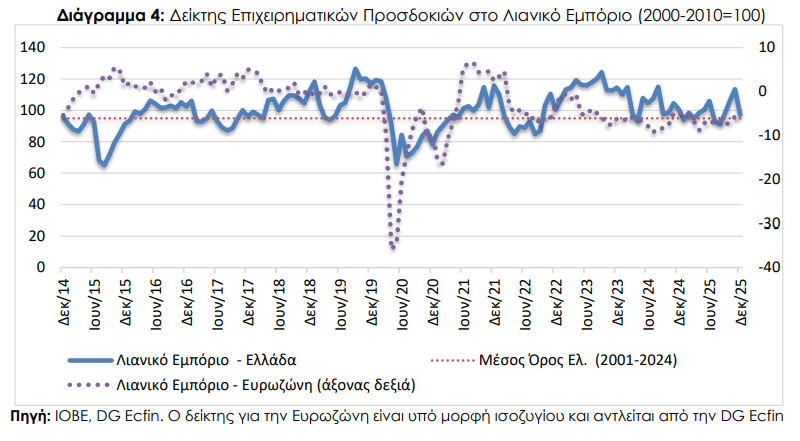 Σύμφωνα με την Έρευνα Οικονομικής Συγκυρίας του ΙΟΒΕ, ο δείκτης επιχειρηματικών προσδοκιών στο λιανικό εμπόριο υποχωρεί έντονα τον Δεκέμβριο και διαμορφώνεται στις 97,2 μονάδες, από 113,5 μονάδες τον Νοέμβριο, με την επιδείνωση να αφορά όλους τους κλάδους, πλην αυτού των οχημάτων-ανταλλακτικών.