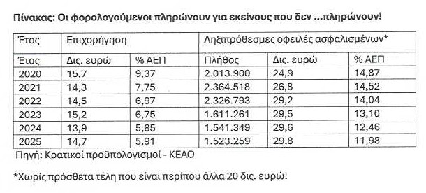 Στο τέλος Σεπτεμβρίου 2025, οι ληξιπρόθεσμες οφειλές στον ΕΦΚΑ ανήλθαν σε 29,8 δις. ευρώ και τα αντίστοιχα πρόσθετα τέλη – επιβαρύνσεις σε 20,8 δις. ευρώ και συνολικά σε 50,7 δις. ευρώ, έναντι 29, 6 δις. ευρώ, 19,3 δις. ευρώ και 48,8 δις. ευρώ αντιστοίχως τον Σεπτέμβριο του 2024, από τις οποίες ποσό 10,39 δισ. ευρώ είναι οφειλές πολύ χαμηλής εισπραξιμότητας. Αυτή εξέλιξη παρατηρείται επί χρόνια παρά τους πολυδάπανους οργανωτικούς μετασχηματισμούς και προγράμματα εξυγίανσης του ΙΚΑ, την ίδρυση του Κέντρου Είσπραξης Ασφαλιστικών Εισφορών (ΚΕΑΟ) το 2013 και την ενοποίηση όλων των ασφαλιστικών οργανισμών και του ΙΚΑ σε έναν ενιαίο ασφαλιστικό οργανισμό, τον γνωστό e-ΕΦΚΑ το 2016 με έναρξη λειτουργίας το 2017 και παρά το γεγονός ότι από τον Μάιο του 2019 μεγάλο πλήθος οφειλετών επωφελήθηκε των ευνοϊκών διατάξεων για ρύθμιση των οφειλών βάσει των άρθρων 1-18 του Ν. 4611/2019, με την οποία δόθηκε δυνατότητα αποπληρωμής της οφειλής σε έως 120 ισόποσες μηνιαίες δόσεις, με ελάχιστο ποσό δόσης 50 ευρώ και επιτόκιο περίπου 3% και σημαντικές διαγραφές σε προσαυξήσεις.