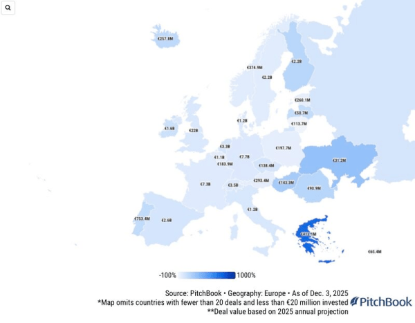 Στη γενική εικόνα, σύμφωνα με τα στοιχεία του PitchBook, οι επενδύσεις VC στην Ευρώπη εκτιμάται ότι έφτασαν τα 66 δισ. ευρώ το 2025, αυξημένες κατά 6,5% σε σχέση με το 2024.