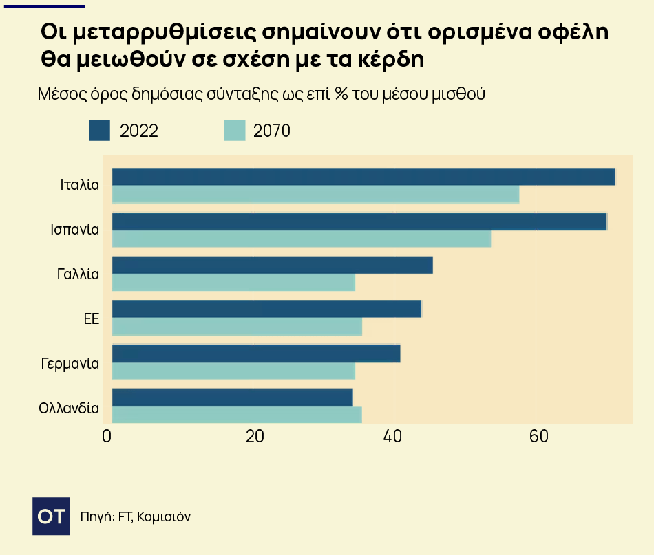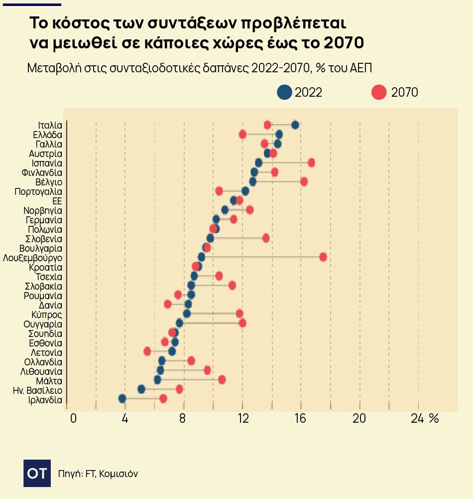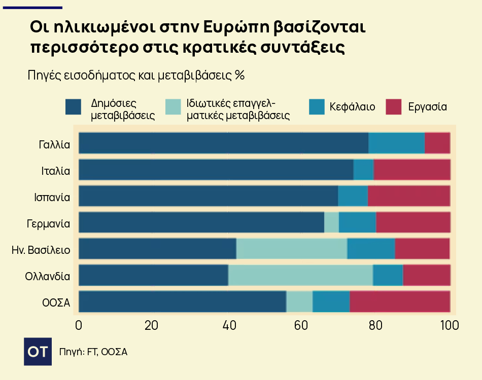Σε ολόκληρη την ΕΕ, το 47% των δαπανών κοινωνικής προστασίας του προϋπολογισμού δαπανάται για συντάξεις γήρατος και επιζώντων, ενώ το 36,7% δαπανάται για ασθένειες και αναπηρίες και το 8,7% για οικογένειες και παιδιά. Ακόμη και στο Ηνωμένο Βασίλειο, όπου ο ιδιωτικός τομέας διαδραματίζει σημαντικότερο ρόλο, η δημοσιονομική εποπτική αρχή της χώρας έχει προβλέψει ότι οι δαπάνες για τις κρατικές συντάξεις — το δεύτερο μεγαλύτερο κονδύλι στον κρατικό προϋπολογισμό μετά την υγεία — θα αυξηθούν από σχεδόν 5% του ΑΕΠ σε 7,7% έως τις αρχές της δεκαετίας του 2070. Η Ιταλία έχει το υψηλότερο κόστος συντάξεων στην ΕΕ, με ποσοστό λίγο πάνω από το 15% του ΑΕΠ, σύμφωνα με στατιστικά στοιχεία της Ευρωπαϊκής Επιτροπής. Η Γαλλία και η Ελλάδα δαπανούν πάνω από 14% η καθεμία. Στη Γερμανία, το ένα τρίτο των συνολικών εσόδων από τους ομοσπονδιακούς φόρους θα δαπανηθεί για την κάλυψη των ελλειμμάτων του κρατικού συνταξιοδοτικού συστήματος φέτος, σύμφωνα με εκτίμηση του οικονομικού think-tank Ifo του Μονάχου.