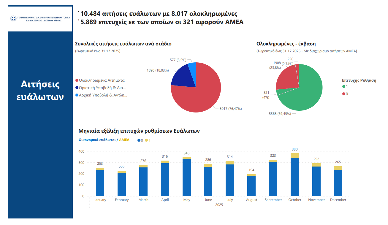 Συγκεκριμένα, τον μήνα Δεκέμβριο 2025, οι επιτυχείς ρυθμίσεις έφτασαν τις 2.294, εκ των οποίων: