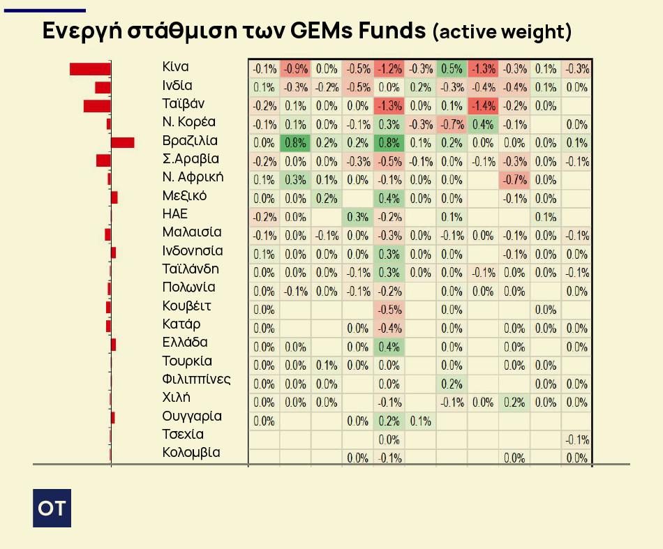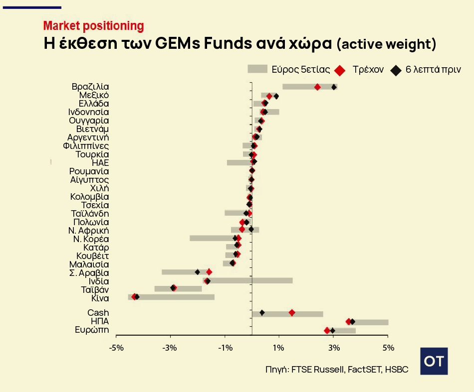 Τα Global Emerging Markets (GEMs) funds εμφανίζονται σήμερα καθαρά overweight στην ελληνική αγορά, τοποθετώντας τη χώρα στις υψηλότερες θέσεις παγκοσμίως, δίπλα σε αγορές όπως η Βραζιλία και το Μεξικό.