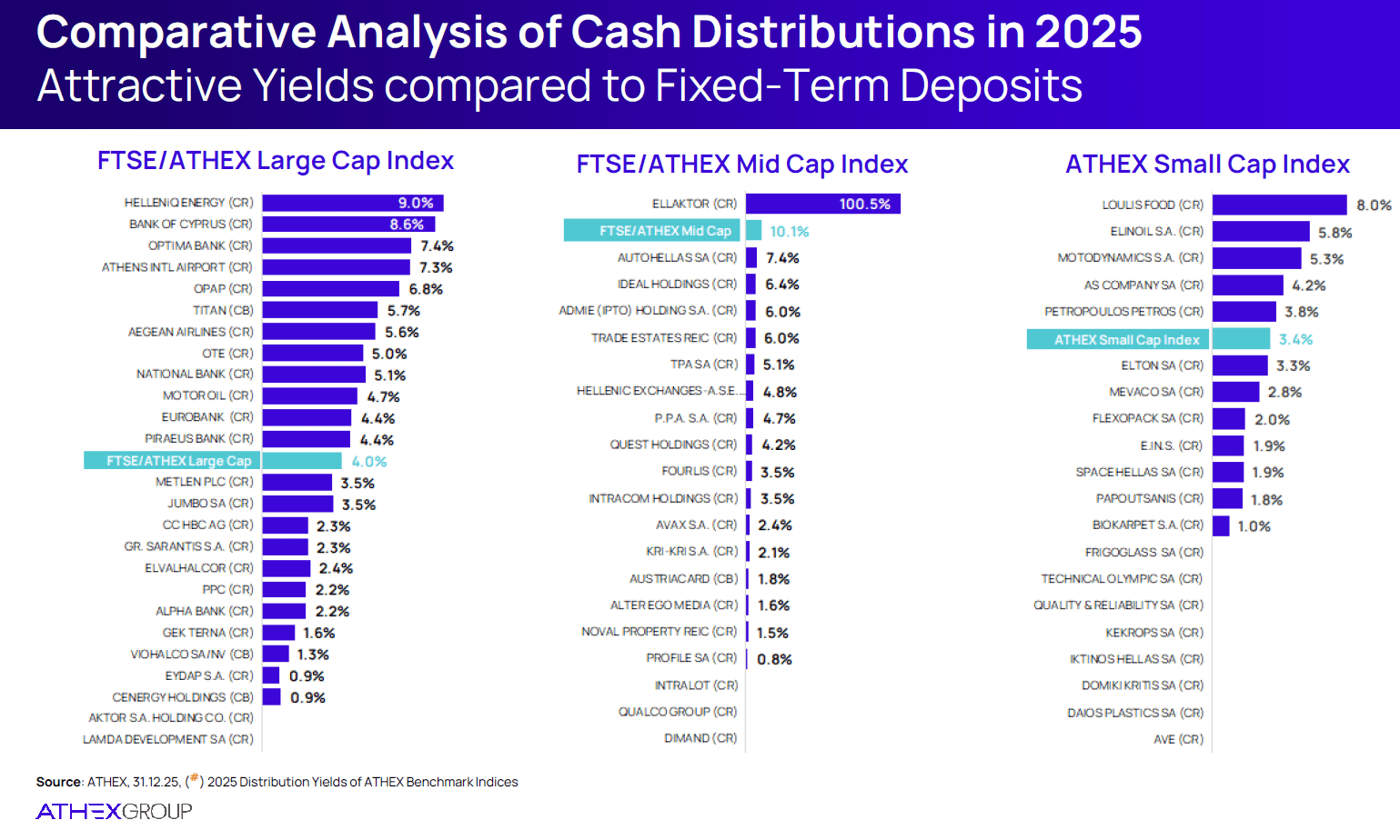 Ακόμη και σε αυτό το σενάριο, το 2025 ανέδειξε τις αποδόσεις μερισμάτων ως κρίσιμο παράγοντα προσέλκυσης επενδυτικού ενδιαφέροντος, ειδικά σε σύγκριση με τις αποδόσεις σταθερών καταθέσεων, που παραμένουν σε χαμηλά επίπεδα.