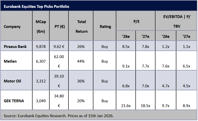 Πέραν του τραπεζικού κλάδου, η Eurobank Equities δίνει έμφαση σε επιλεγμένες μη χρηματοοικονομικές εταιρείες με ορατή πορεία κερδοφορίας και ειδικούς καταλύτες. Στις κορυφαίες επιλογές περιλαμβάνονται η Metlen, λόγω επαναφοράς της κερδοφορίας, άρσης τεχνικών πιέσεων και ελκυστικής αποτίμησης, καθώς και η Motor Oil, η οποία επωφελείται από το ισχυρό περιβάλλον διύλισης και τις αποδόσεις των επενδύσεων των προηγούμενων ετών.