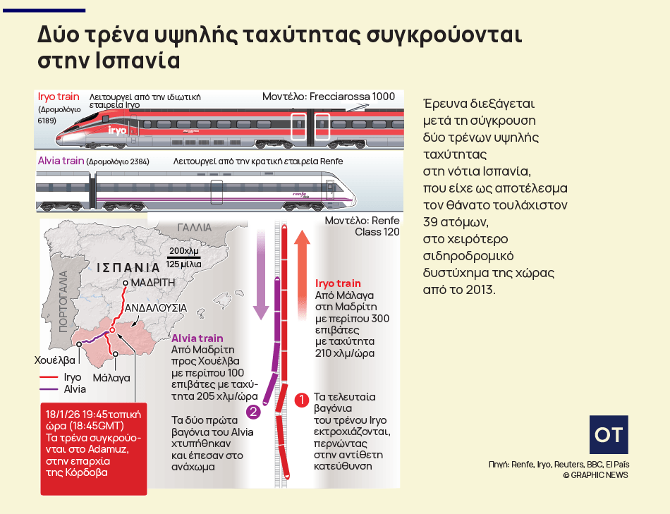 Στο ατύχημα ενεπλάκησαν δύο τρένα υψηλής ταχύτητας, το ένα λειτουργούσε από τον ιδιωτικό όμιλο Iryo και το άλλο από την Alvia, που διαχειρίζεται η ισπανική δημόσια σιδηροδρομική εταιρεία Renfe.