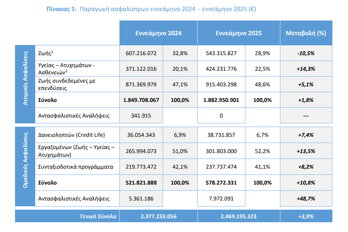 Κατά 3,9% αυξήθηκε η παραγωγή ασφαλίσεων Ζωής και Υγείας στο εννεάμηνο του 2025 και ανήλθε σε 2.469.195.323 ευρώ έναντι 2.377.233.056 ευρώ το αντίστοιχο χρονικό διάστημα του 2024.