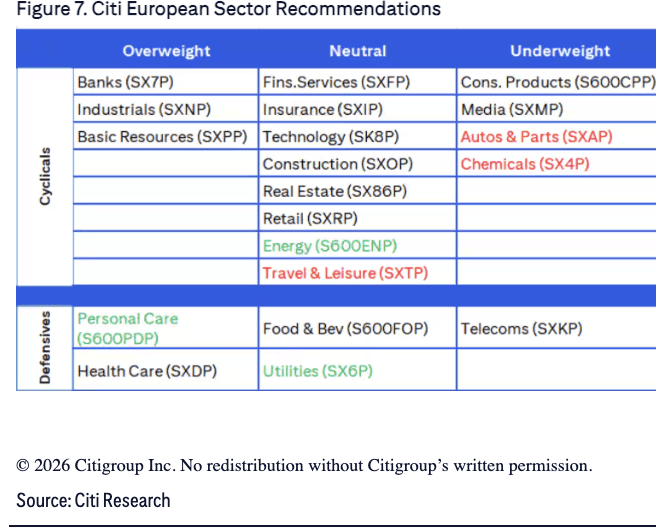 Η Citigroup διατηρεί σύσταση «αύξησης θέσεων» (overweight) στους τομείς των τραπεζών, της βιομηχανίας των βασικών πρώτων υλών, της άμυνας, της προσωπικήςφροντίδας και της υγείας.