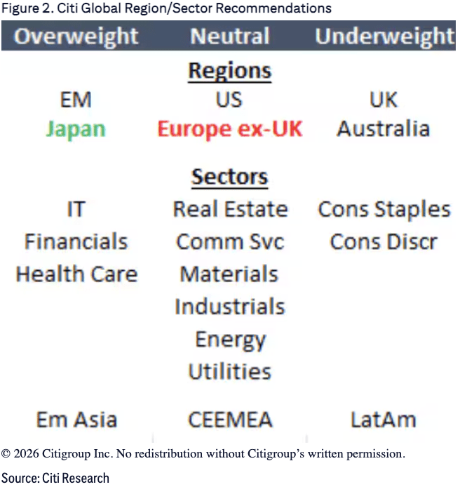 Συνολικά διατηρεί συστάσεις «αύξησης θέσεων» στις αναδυόμενες αγορές και την Ιαπωνία (αναβάθμιση από ουδέτερη θέση), «ουδέτερη θέση» στην Ευρώπη εκτός Βρετανίας και τις ΗΠΑ και «μείωση θέσεων» σε Βρετανία και Αυστραλία. Οι τιμές στόχου για το τέλος του 2026 που δίναν οι αναλυτές της Citigroup, αφορούσαν για τον παγκόσμιο δείκτη μετοχών MSCI AC World τις 1360 μονάδες, για τον S&P 500 των ΗΠΑ τις 7700 μονάδες, για τον ευρωπαϊκό δείκτη Stoxx 600 τις 640 μονάδες για τον Topix της Ιαπωνίας τις 3900 μονάδες και για τον παγκόσμιο δείκτη αναδυομένων αγορών MSCI EM ($) τις 1540 μονάδες.