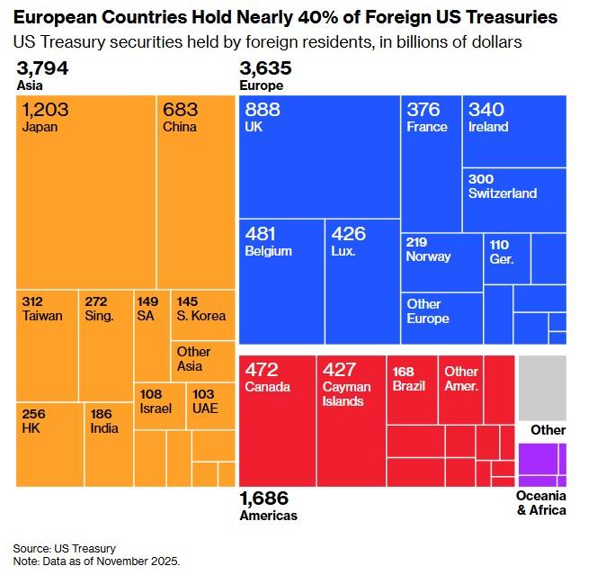 Οι ευρωπαϊκές χώρες κατέχουν τρισεκατομμύρια δολάρια σε αμερικανικά ομόλογα και μετοχές, μερικά από τα οποία βρίσκονται σε χαρτοφυλάκια του δημόσιου τομέα. Αυτό πυροδοτεί εικασίες ότι θα μπορούσαν να πουλήσουν τέτοια περιουσιακά στοιχεία σε απάντηση στις ανανεωμένες απειλές δασμών του Τραμπ, ενδεχομένως αυξάνοντας το κόστος δανεισμού και μειώνοντας τις μετοχές δεδομένης της εξάρτησης των ΗΠΑ από το ξένο κεφάλαιο.