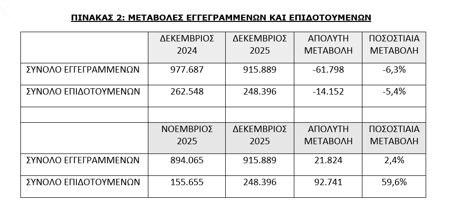 Ο αριθμός των επιδοτούμενων για τον μήνα Δεκέμβριο 2025 ανήλθε σε 248.396 άτομα καταγράφοντας μείωση κατά -14.152 άτομα (-5,4%) σε σχέση με τον αντίστοιχο μήνα του προηγούμενου έτους Δεκέμβριο 2024 και αύξηση κατά 92.741 άτομα (59,6%) σε σχέση με τον προηγούμενο μήνα Νοέμβριο 2025.