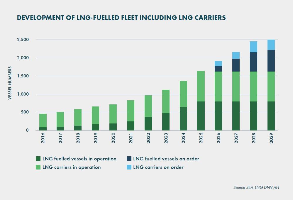 Οι προοπτικές για την περαιτέρω ανάπτυξη του LNG παραμένουν ιδιαίτερα θετικές. Μέχρι το 2029 εκτιμάται ότι θα βρίσκονται σε λειτουργία περίπου 2.500 ποντοπόρα πλοία με καύσιμο LNG, εκ των οποίων περίπου 1.450 θα κινούνται με LNG ή βιομεθάνιο και 1.050 θα είναι πλοία μεταφοράς LNG.