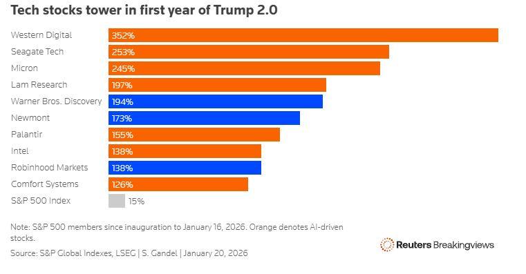 Λίγα πράγματα εξελίχθηκαν όπως είχε προβλεφθεί μετά την ανάληψη της προεδρίας από τον Τραμπ ακριβώς πριν από ένα χρόνο. Οι αμερικανικοί δασμοί δεν προκάλεσαν τη ζημιά που πολλοί είχαν προβλέψει, αφήνοντας τους αναλυτές της αγοράς για άλλη μια φορά σε δύσκολη θέση, όπως συνέβη όταν οι μετοχές των εταιρειών πετρελαίου και φυσικού αερίου υπερδιπλασιάστηκαν υπό την προεδρία του υπέρμαχου των ανανεώσιμων πηγών ενέργειας Τζο Μπάιντεν και οι εταιρείες υγειονομικής περίθαλψης αψήφησαν τις προβλέψεις υπό την προεδρία του Μπαράκ Ομπάμα. Ομοίως, η GEO Group κατασκευαστής σωφρονιστικών εγκαταστάσεων, έχει χάσει σχεδόν το 50% της αξίας του και ο ενεργειακός γίγαντας ConocoPhillips 8% από την επιστροφή του Τραμπ.