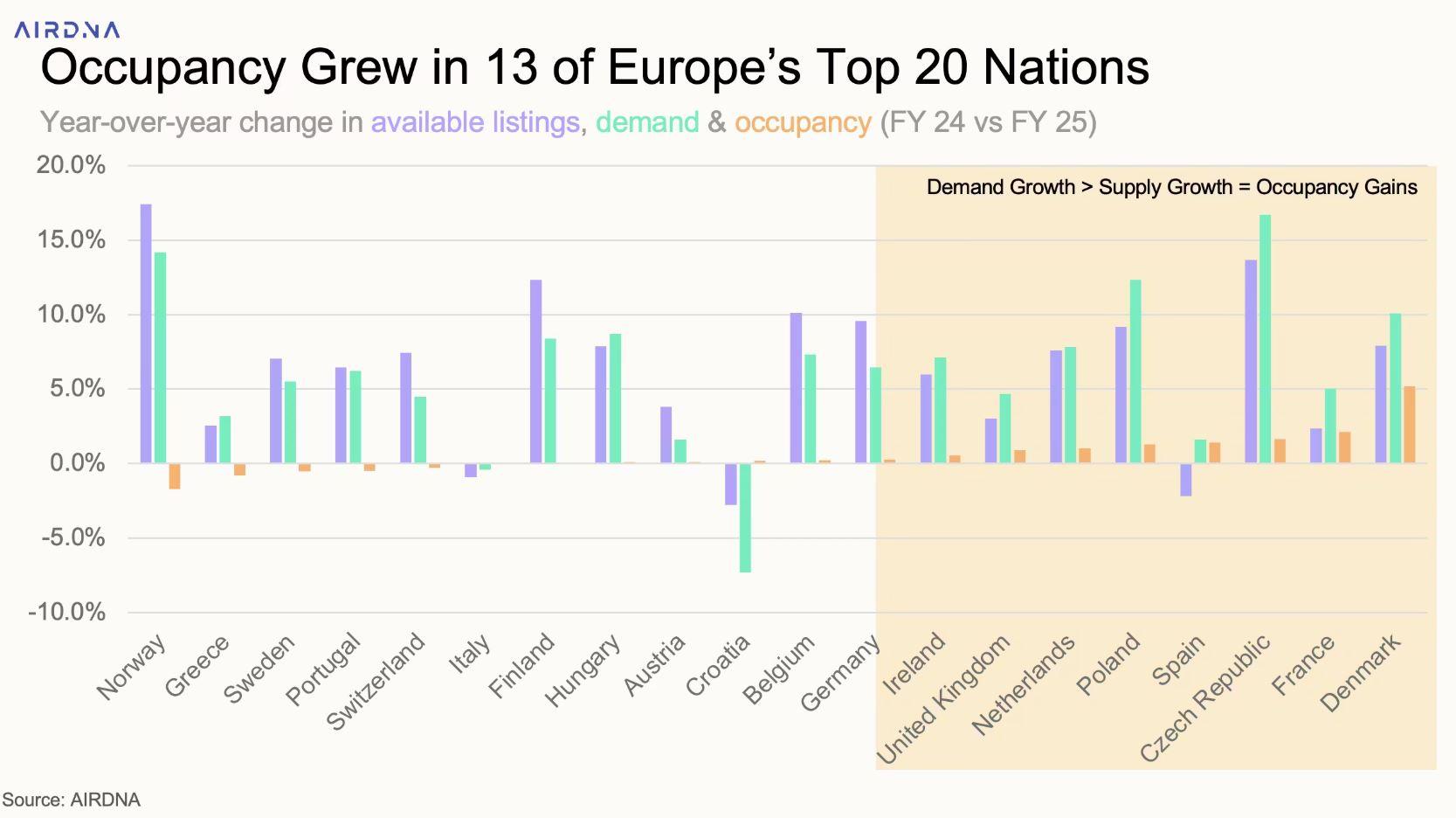 Η ευρωπαϊκή αγορά βραχυπρόθεσμων ενοικιάσεων το 2025 σημείωσε βραδύτερη αύξηση της προσφοράς λόγω των αυστηρότερων κανονισμών σε όλη την Ευρώπη. Η προσφορά αυξήθηκε μόνο κατά 3,5%, από 18,1% το 2024. Ενώ η αύξηση της προσφοράς επιβραδύνθηκε σε ένα πιο βιώσιμο επίπεδο, η ζήτηση συνέχισε να αυξάνεται σταθερά κατά 4,4%, οδηγώντας σε αύξηση της πληρότητας κατά 0,7%.