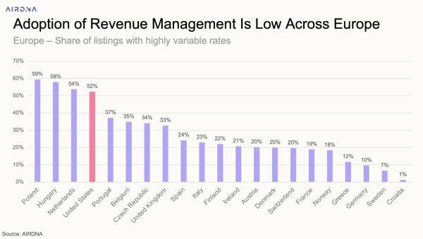 Ενδιαφέρον είναι και το στοιχείο ότι μόλις το 12% των οικοδεσποτών που χρησιμοποιούν στρατηγικές διαχείρισης εσόδων όταν στις ΗΠΑ το ανάλογο ποσοστό είναι στο 52% και μόλις τρεις ευρωπαϊκές χώρες είναι σε ποσοστά υψηλότερα των ΗΠΑ. Η Πολωνία στο 59%, η Ουγγαρία στο 58% και η Ολλανδία στο 54%. Αντιθέτως σε άλλες ώριμες αγορές τα ποσοστά είναι χαμηλά όπως στην Ισπανία που βρίσκεται στο 24%, στη Γερμανίαςστο 10% κ.λ.π.