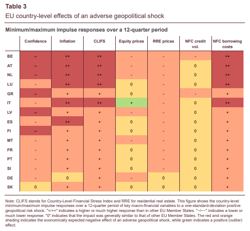 Επιπλέον, οι γεωπολιτικές κρίσεις επιδεινώνουν τις χρηματοπιστωτικές συνθήκες τόσο σε παγκόσμιο επίπεδο όσο και στην ΕΕ, αυξάνοντας τα επίπεδα χρηματοπιστωτικής πίεσης, αυξάνοντας το κόστος δανεισμού και περιορίζοντας την πίστωση προς τις επιχειρήσεις. Αυτό υπογραμμίζει τη σημασία της ενσωμάτωσης του γεωπολιτικού κινδύνου στις αξιολογήσεις της χρηματοπιστωτικής σταθερότητας, με ιδιαίτερη έμφαση στην ετερογένεια μεταξύ των χωρών.