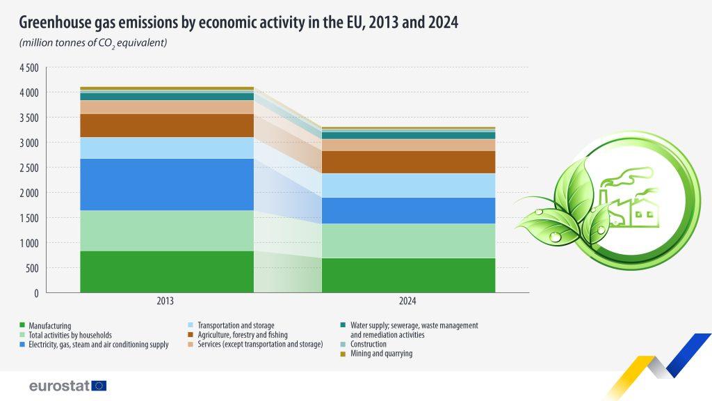 Το 2024, οι εκπομπές αερίων του θερμοκηπίου της οικονομίας της ΕΕ από οικονομικές δραστηριότητες και νοικοκυριά ανήλθαν συνολικά σε 3,3 δισεκατομμύρια τόνους ισοδυνάμων CO2. Αυτό αντιπροσωπεύει μείωση κατά 1 % σε σύγκριση με το 2023 και μείωση κατά 20 % σε σύγκριση με το 2013.