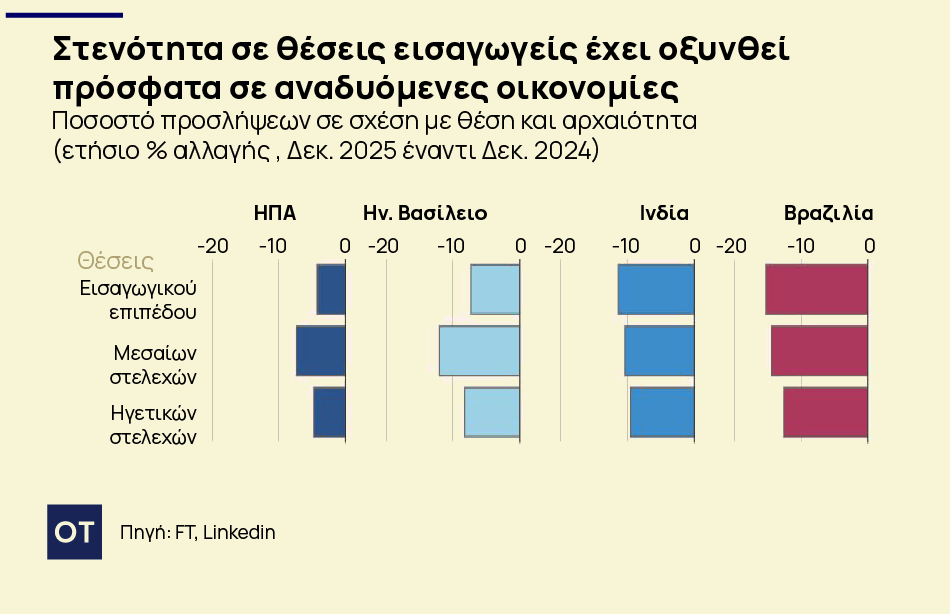 Για τις μεγαλύτερες αμερικανικές εταιρείες, το μέσο μερίδιο των εργαζομένων εισαγωγικού επιπέδου σε όλες τις λειτουργίες εργασίας παραμένει σταθερό ή συρρικνώνεται, σύμφωνα με στοιχεία από την έκθεση του LinkedIn. Από την άνθηση των προσλήψεων μετά την πανδημία, από το 2023 έως το 2025, οι τομείς της νομικής, των ακινήτων και της λογιστικής παρουσίασαν τις πιο απότομες μειώσεις, ενώ προηγουμένως αναπτυσσόμενοι τομείς όπως η συμβουλευτική και το ανθρώπινο δυναμικό άλλαξαν πορεία.