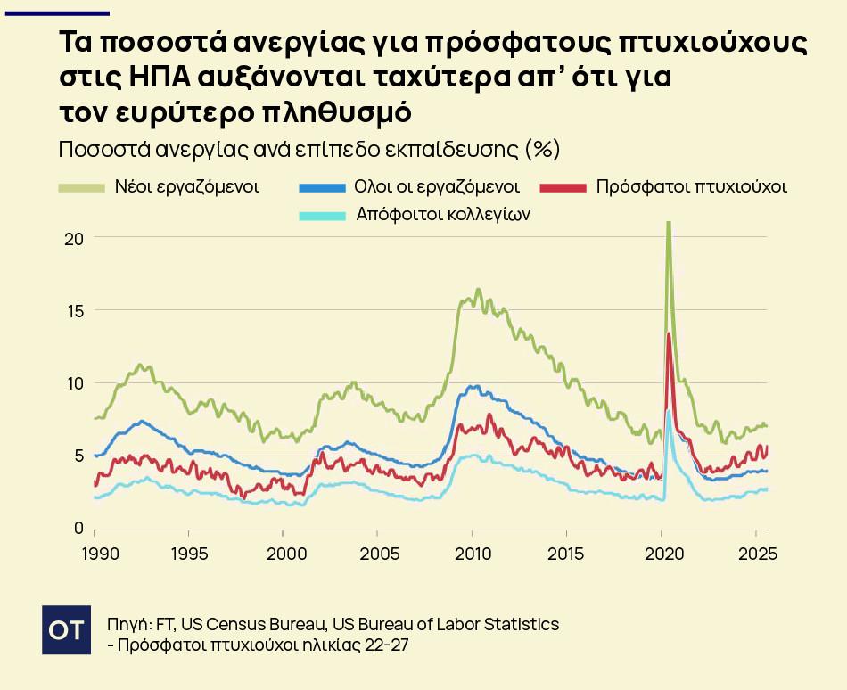 Παρόμοια εικόνα υπάρχει και στις ΗΠΑ, όπου η ανεργία μεταξύ των νέων πτυχιούχων αυξάνεται ταχύτερα από τον ευρύτερο πληθυσμό. Τα στοιχεία της Ομοσπονδιακής Τράπεζας της Νέας Υόρκης για τον περασμένο Αύγουστο δείχνουν ότι για τους πρόσφατους πτυχιούχους ηλικίας 22-27 ετών ανέρχεται στο 5,8% έναντι 4,1% για όλους τους εργαζόμενους.