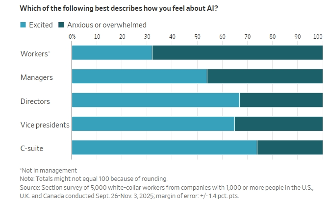Σε κάθε περίπτωση, η πίστη των επιχειρηματικών ηγετών στις δυνατότητες της τεχνητής νοημοσύνης να αυξήσει την παραγωγικότητα δοκιμάζεται στην πράξη από το ίδιο το εργατικό δυναμικό τους, αναφέρει η Wall Street Journal.