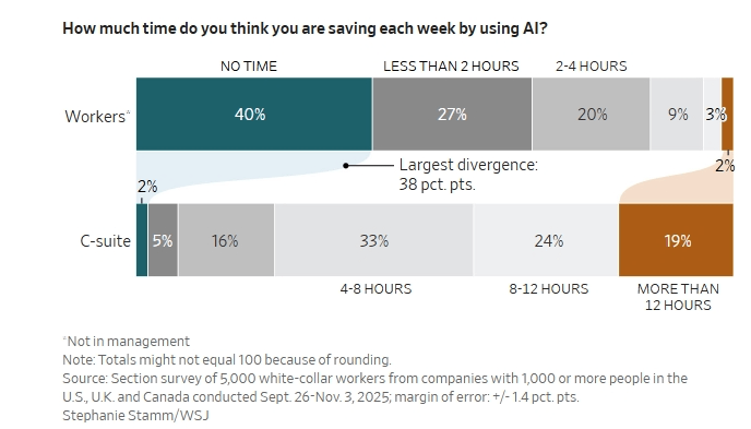Οι εργαζόμενοι δηλώνουν ότι η τεχνητή νοημοσύνη δεν τους εξοικονομεί πολύ χρόνο στην καθημερινή τους εργασία μέχρι στιγμής, ενώ πολλοί αναφέρουν ότι αισθάνονται αμηχανία ως προς τον τρόπο ενσωμάτωσής της στην εργασία τους. Εν τω μεταξύ, οι εταιρείες ξοδεύουν τεράστια ποσά στην τεχνητή νοημοσύνη, στοιχηματίζοντας ότι η δύναμη της τεχνολογίας να επιταχύνει τα πάντα, από τις πωλήσεις έως τις λειτουργίες του back-office, θα εγκαινιάσει μια νέα εποχή αποδοτικότητας και αύξησης των κερδών.