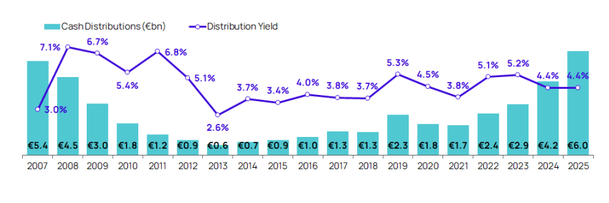 Μόνο το 2025, οι διανομές αυξήθηκαν κατά 42%, προσθέτοντας επιπλέον 1,8 δισ. ευρώ, με το συνολικό ποσό να υπερβαίνει τα 5,4 δισ. ευρώ – επίπεδα υψηλότερα ακόμη και από την προ κρίσης κορύφωση του 2007. Η μερισματική απόδοση διαμορφώθηκε στο 4,4%, σχεδόν τριπλάσια από τις αποδόσεις των προθεσμιακών καταθέσεων.