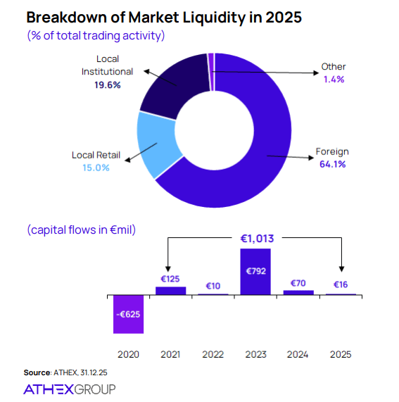 Το 2025 ήταν μια χρονιά σταθμός για το Χρηματιστήριο Αθηνών. Για τρίτη συνεχόμενη χρονιά, οι ξένοι θεσμικοί επενδυτές κατέγραψαν καθαρές εισροές, παρά το γεγονός ότι στο τέταρτο τρίμηνο παρατηρήθηκε αύξηση των εκροών, σε ένα περιβάλλον γενικότερης διεθνούς μεταβλητότητας. Οι ισχυρότεροι μήνες αποδείχθηκαν ο Φεβρουάριος, ο Μάιος και ο Αύγουστος, περίοδοι κατά τις οποίες οι εισροές ενίσχυσαν αισθητά τη συναλλακτική δραστηριότητα και έδωσαν βάθος στην αγορά.