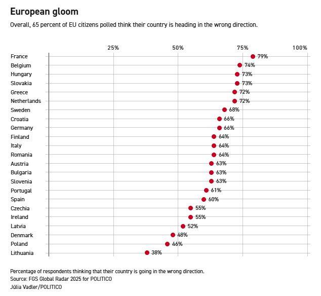 Σε σχεδόν όλες τις χώρες που συμμετείχαν στην έρευνα, η πλειοψηφία πιστεύει ότι η χώρα τους βρίσκεται σε λάθος δρόμο. Το εντυπωσιακό είναι ότι στις εξαιρέσεις περιλαμβάνονται η Πολωνία, η Λιθουανία και η Δανία — παρόλο που βρίσκονται μεταξύ των χωρών που είναι πιο εκτεθειμένες στη Ρωσία ή, στην περίπτωση της Δανίας, στην πίεση των ΗΠΑ για τη Γροιλανδία.