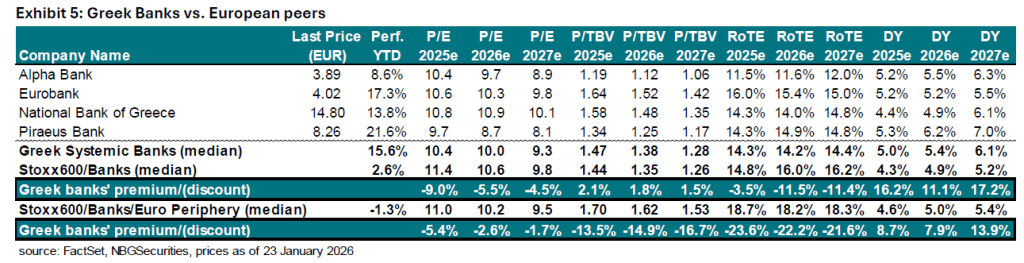 Παρά την υπεραπόδοση, με μέσο δείκτη P/TBV (με βάση τις εκτιμήσεις του 2026) στο 1,38x (περιφέρεια: 1,62x, STOXX: 1,35x) και μερισματική απόδοση 5,4% (περιφέρεια: 5,0%, STOXX: 4,9%), οι ελληνικές τράπεζες συνεχίζουν να διαπραγματεύονται με discount έναντι των ευρωπαϊκών ομοειδών, το οποίο, σύμφωνα με την NBG Securities, δεν δικαιολογείται.