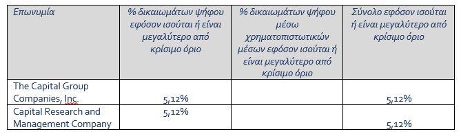 Η Τράπεζα Eurobank Ανώνυμη Εταιρεία («Eurobank») ανακοινώνει, σύμφωνα με τα προβλεπόμενα στο άρθρο 14 του ν.3556/2007, όπως ισχύει, και με βάση τη σχετική γνωστοποίηση που έλαβε από την εταιρεία «The Capital Group Companies, Inc.» (εφεξής «CGC»), ότι την 21.01.2026, το ποσοστό των δικαιωμάτων ψήφου επί των κοινών μετοχών της Eurobank που κατείχε έμμεσα η CGC, ανήλθε του ορίου του 5% επί του συνολικού αριθμού των δικαιωμάτων ψήφου της Eurobank, και το ποσοστό δικαιωμάτων ψήφου της CGC στο μετοχικό κεφάλαιο της Eurobank διαμορφώθηκε σε 5,12%, ποσοστό που αντιστοιχεί σε 185.981.494 δικαιώματα ψήφου επί κοινών μετοχών της Eurobank.
